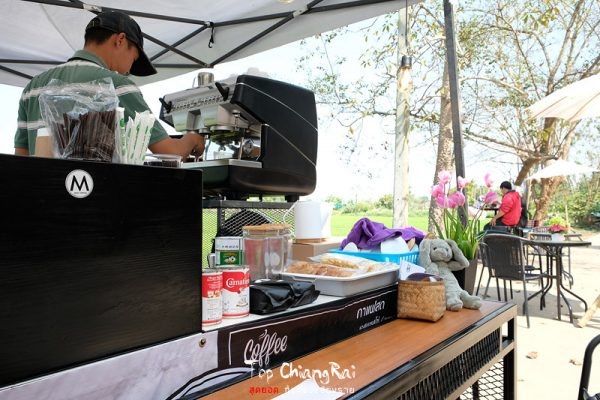 ร้านกาแฟตั้งอยู่บนถนนกาสะลอง ปากทางเข้าสินธานีโครงการ 10 เส้นทางไปวัดห้วยปลากั้ง